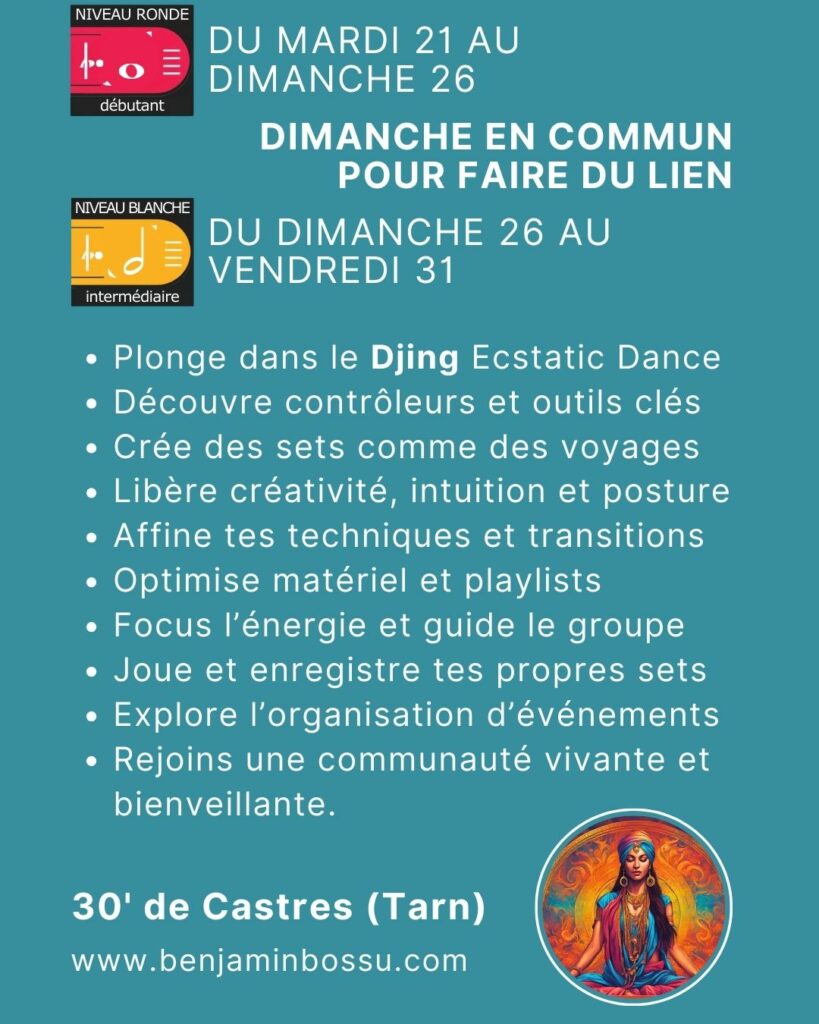✅ C’est ici que ça se passe : Niveau BLANCHE (2) – un accompagnement pour perfectionner ta technique (loops, transitions, gestion avancée des playlists), affiner ton identité musicale, apprendre à connecter à l’énergie d’un groupe et structurer tes propres événements.