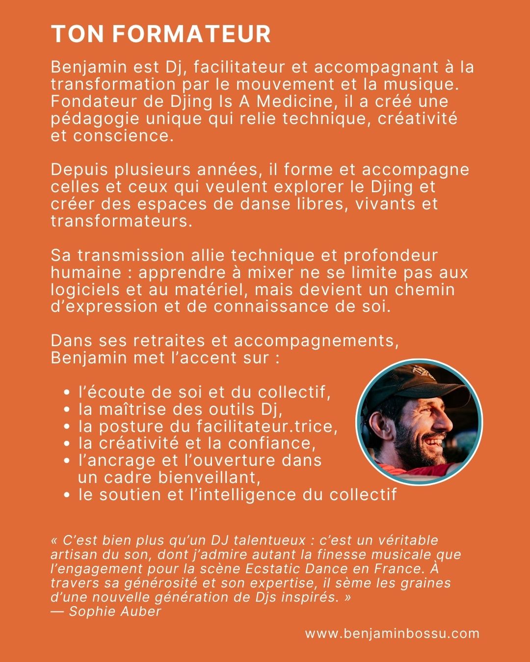 Benjamin (alias Dj Eituim), facilitateur et fondateur de Djing Is A Medicine, transmet une pédagogie vivante où le Djing devient un chemin d’expression, d’écoute et de connaissance de soi.
